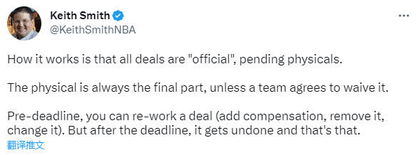 但NBA记者KeithSmith表示:交易流程就是所有的交易都是‘官方’的,只待体检。体检永远是最后一个环节,除非有球队同意放弃体检。在截止日之前,你可以重新处理交易(添加补偿、删除补偿、更改交易内容)。但是在截止日之后,交易只能被撤消。