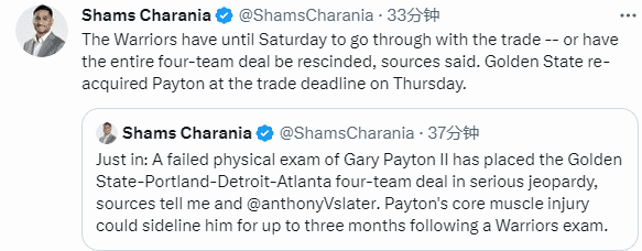 勇士必须在周日之前完成交易或者取消交易;之后shams披露更多内幕,开拓者医疗组一直在给小佩顿注射止痛药,督促他挺过伤病。并且,开拓者在交易谈判中没有把这件事告知勇士。对于此事,开拓者方面拒绝评论。