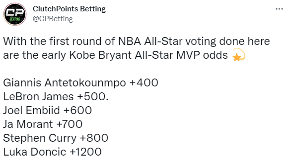 谁会夺得2023年全明星赛科比-布莱恩特MVP奖杯?最新赔率显示——1、字母哥+400;2、詹姆斯+500;3、恩比德+600;4、莫兰特+700;5、库里+800和6、东契奇+1200。