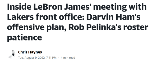 来源:24直播网08-10 19:4824直播网08月10日讯 湖人球星詹姆斯和他的经纪人里奇-保罗,在上周与湖人总经理佩林卡和主教练达文-哈姆进行会面。詹姆斯已经有资格和湖人提前续签2年9710万美元的合同。北京时间8月10日,名记克里斯-海耶斯揭秘了这次会面的具体内容——