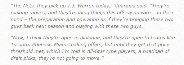 shams还表示:篮网签下了TJ-沃伦,他们正在采取行动,他们休赛期的操作,在他们看来,这些运作是做好了下赛季带回这两人的准备。现在,我认为他们在交易对话中是开放的,他们愿意接受猛龙、太阳、热火等球队的报价,但在他们的价格达到门槛之前,他们不会进行交易。我被告知(篮网对杜兰特的要价)是全明星类型的球员和一船的选秀权。