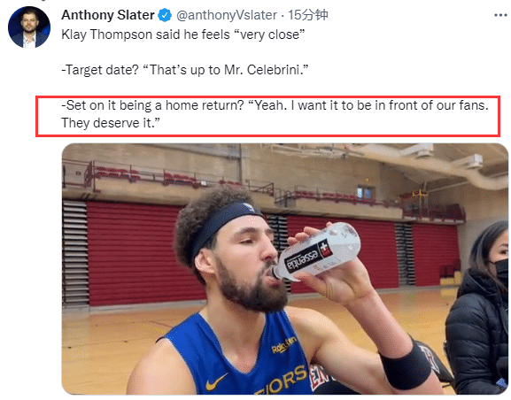 勇士记者Anthony Slater报道,汤普森表示他感觉自己费城接近复出,但目前透露具体的复出时间表,他说:两年来的第一次,我想要在勇士球迷面前复出,他们应得的。