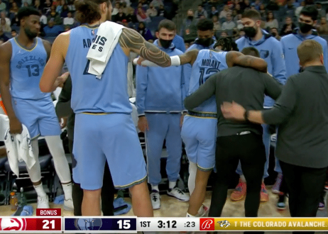 对老鹰一战,第一节还剩3分12秒的时候,灰熊半场进攻,莫兰特带球试图突破赫尔特的防守。就在他启动突破时,科林斯前来包夹,莫兰特往边线带球,随后就只能单脚跳着。当时前方报道称,莫兰特被搀扶回更衣室,左腿已经不能受力,显得非常痛苦。