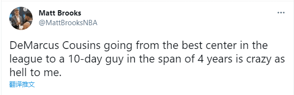 对于考辛斯的惨痛经历,篮网记者Matt Brooks发推写道:在4年的时间里,考辛斯从联盟最好的中锋变成了一个10天短合同球员,这简直太疯狂了。