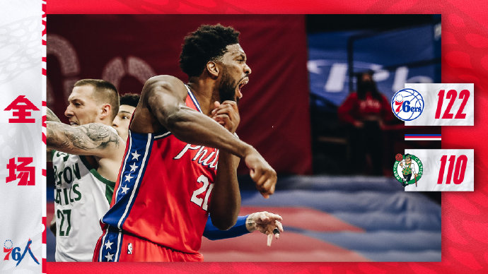 76人122-110战胜凯尔特人 恩比德38+11 杰伦-布朗42+9