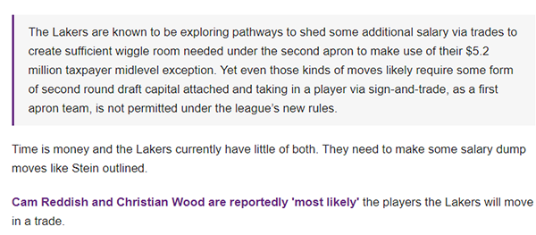 湖人想要补强球队,不过他们只有消减一些薪水,才能使用520万美元的中产特例,Marc Stein报道称,湖人队正在探索通过交易减少一些额外工资的途径,以在第二土豪线下创造足够的回旋余地,从而利用他们的520万美元的中产特例。不过即使是这些举措,湖人也可能搭上二轮选秀权,根据联盟的新规,总薪水超过第一土豪线的球队,不准通过先签后换的方式引进球员。