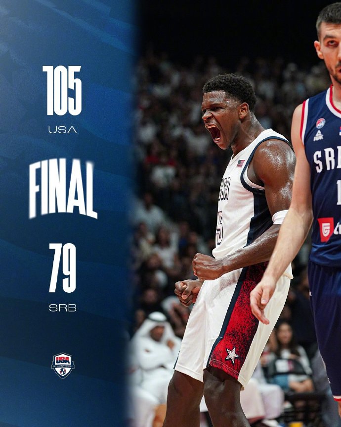 末节,浓眉攻防两端持续发威,美国队在爱德华兹得分后87-61领先,库里再次命中三分后美国队90-61领先,大比分领先的美国队打出了showtime,詹姆斯有空接有强攻,库里继续命中三分,美国97-66领先。双方逐渐启用了替补球员,最终美国男篮105-79大胜背靠背出战的塞尔维亚。