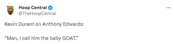 太阳球星凯文-杜兰特和森林狼球星安东尼-爱德华兹一起参加了由Fanatics公司举办的球迷活动,活动期间主持人问杜兰特:这几天和爱德华兹在一起的感觉怎么样?”杜兰特:“伙计,我管他叫‘小山羊’(Baby GOAT),你懂我的意思。“