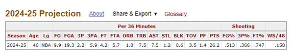 来源:24直播网08-18 12:5424直播网讯 2024年巴黎奥运会已经结束,詹姆斯带领美国男篮夺得金牌,那么老詹会在NBA新赛季打出怎样的表现?美知名数据网站BBR预测詹姆斯新赛季数据:每36分钟拿到26.2分7.5篮板7.5助攻1.2抢断,投篮命中率是51.3%,三分命中率为36.6%,罚球命中率是74.7%。