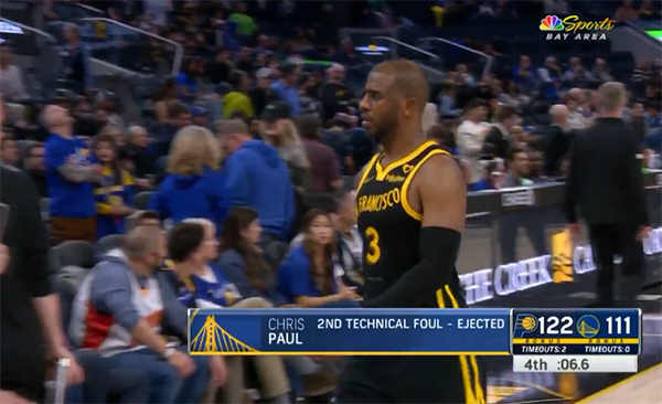 来源:24直播网03-23 15:4124直播网讯 北京时间3月23日,勇士主场不敌步行者,终场前6.6秒,保罗因抱怨裁判连续吃到两次技犯,直接被驱逐离场。