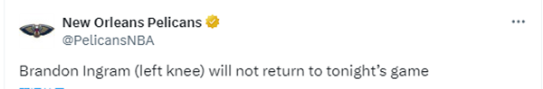 英格拉姆重伤离场,鹈鹕战局受影响