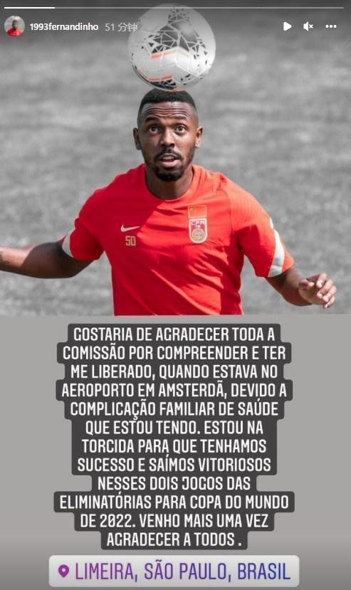 费南多写道:“因为家庭成员出现一些健康问题,我要感谢足协在阿姆斯特丹机场后的理解和放行。我很期待球队能够在接下来两场比赛中取得胜利。”
