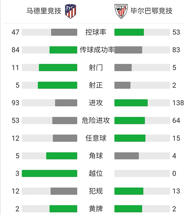 全场比赛结束,马竞主场2-1逆转毕尔巴鄂。